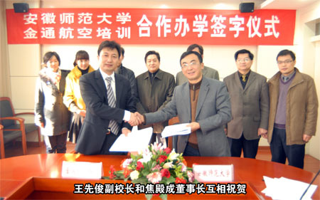 安徽師范大學(xué)與“金通航空培訓(xùn)” 簽訂合作辦學(xué)協(xié)議 本報訊 在2010年即將過去,2011年即將到來之際,“金通航空培訓(xùn)”又一所合作辦學(xué)院校正式宣告建立。2010年12月21日上午,安徽師范大學(xué)與金通航空培訓(xùn)服務(wù)有限公司合作辦學(xué)協(xié)議簽訂儀式在安徽蕪湖舉行。受安徽師范大學(xué)黨委和行政的委托,安徽師范大學(xué)副校長王先俊教授、黨校辦主任馬三保先生、傳媒學(xué)院黨委書記胡靖先生、教務(wù)處副處長江家發(fā)教授、招生辦副主任馬廣見先生,“金通航空培訓(xùn)”董事長兼總經(jīng)理焦殿成先生、副總經(jīng)理郭文先生、董事長助理付曉軍先生、南京工作處主任安宏林女士,參加并見證了合作辦學(xué)簽字儀式。 在熱情友好的氣氛中,經(jīng)安徽師范大學(xué)法人代表、校長王倫教授授權(quán),安徽師范大學(xué)副校長王先俊教授和金通航空培訓(xùn)服務(wù)有限公司董事長兼總經(jīng)理焦殿成先生在《合作辦學(xué)協(xié)議》上簽字。