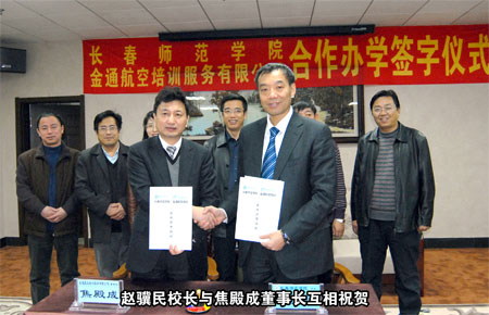合作雙贏、共謀事業(yè)、科學(xué)發(fā)展 長春師范學(xué)院與“金通航空培訓(xùn)” 簽訂合作辦學(xué)協(xié)議 本報訊 高校和企業(yè)合作培養(yǎng)人才是一種新型的育才模式,通過校企合作可以為大學(xué)生提供良好的培養(yǎng)教育和實習(xí)場所,構(gòu)建起高校畢業(yè)生成才就業(yè)的橋梁。為了填補吉林省高校中本科空乘專業(yè)的空白,提升長春師范學(xué)院和“金通航空培訓(xùn)”的辦學(xué)模式及社會影響力,2010年 12月15日下午,長春師范學(xué)院與“金通航空培訓(xùn)”合作辦學(xué)簽字儀式在長春隆重舉行。長春師范學(xué)院黨委書記張興海、校長趙驥民、副校長劉春明、校長助理楊以綱以及學(xué)院教務(wù)處、招生辦領(lǐng)導(dǎo),金通航空培訓(xùn)服務(wù)有限公司董事長兼總經(jīng)理焦殿成、副總經(jīng)理兼招生工作部總經(jīng)理肖曉明、董事長助理兼綜合管理部總經(jīng)理付曉軍,參加了合作辦學(xué)簽字儀式。
