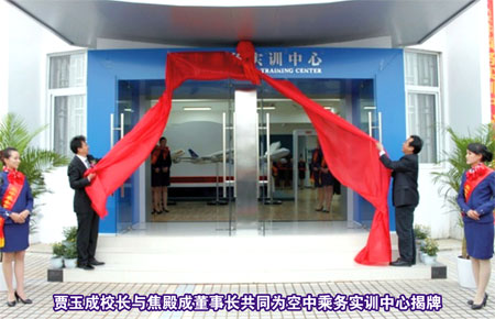 “金通航空培訓(xùn)”焦殿成董事長與桂林旅專賈玉成校長共同為乘務(wù)實(shí)訓(xùn)中心揭牌。校企雙方領(lǐng)導(dǎo)為模擬艙剪彩。