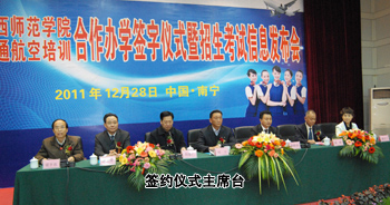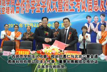 本網(wǎng)訊:伴隨著新年的鐘聲,在2011年即將渡過之際的12月28日,廣西師范學(xué)院文星樓報(bào)告廳充滿了節(jié)日的喜慶氣氛。在這里,廣西師院與北京廣慧金通教育科技有限公司舉行了合作辦學(xué)簽字儀式暨招生考試信息發(fā)布會。廣西師范學(xué)院黨委書記劉力、院長劉慕仁,北京廣慧金通教育科技有限公司董事長兼總經(jīng)理焦殿成、副總經(jīng)理兼院校教學(xué)工作部總經(jīng)理盛美蘭,以及受邀參加的中國南方航空、中國東方航空、廈門航空、深圳航空、長榮航空等各航空公司領(lǐng)導(dǎo)蒞臨觀摩了本次簽約儀式。廣西師范學(xué)院各部門領(lǐng)導(dǎo)以及09、10級新聞傳播學(xué)院的近300名師生列席了簽約儀式。簽約儀式由廣西師范學(xué)院黨委副書記、紀(jì)委書記梁半農(nóng)主持。 廣西師范學(xué)院與北京廣慧金通教育科技有限公司合作開辦的播音與主持藝術(shù)(空中乘務(wù)方向)專業(yè),是廣西自治區(qū)高校中唯一招收空中乘務(wù)藝術(shù)類本科的專業(yè),填補(bǔ)了廣西壯族自治區(qū)在本科學(xué)歷層次空乘人才培養(yǎng)上的空白。而對于“學(xué)高為師,身正為范”的師范類院校來說,肩上重任更是非同一般。廣西師范學(xué)院,自1953年建校以來,就始終秉承著“德才并育,知行合一”的校訓(xùn),厚德載物,迅猛發(fā)展。 簽約儀式開始,梁半農(nóng)副書記宣讀了廣西壯族自治區(qū)教育廳關(guān)于廣西師范學(xué)院與北京廣慧金通教育科技有限公司合作辦學(xué)的批文。 隨后,廣西師范學(xué)院法人代表、校長劉慕仁與北京廣慧金通教育科技有限公司法人代表、董事長焦殿成簽署辦學(xué)協(xié)議。 廣西師范學(xué)院招生就業(yè)處陳宗武處長詳細(xì)地介紹了空乘專業(yè)的學(xué)科建設(shè)、發(fā)展、招生情況、招生原則、招生計(jì)劃、報(bào)告條件及報(bào)考須知等情況。 劉力書記代表廣西師范學(xué)院對出席本次儀式的嘉賓表示熱烈歡迎。劉力書記指出,與金通航空培訓(xùn)聯(lián)合開辦本科層次空乘專業(yè),這是符合雙方及中國民航業(yè)發(fā)展需要、開拓創(chuàng)新、搶抓機(jī)遇的科學(xué)決策;是充分發(fā)揮各處資源優(yōu)勢,實(shí)現(xiàn)雙方互惠共贏的先進(jìn)意識,進(jìn)一步拓寬學(xué)校人力物力資源渠道、增強(qiáng)學(xué)校在社會的影響力。他希望此次校企合作,雙方應(yīng)秉承真誠合作、互利互惠、共同發(fā)展的原則,共同努力、共同見證空乘專業(yè)的成長和壯大,把空乘專業(yè)發(fā)展成為我校及廣西高校的品牌專業(yè)。 董事長焦殿成在簽約儀式上致辭。他說,廣西是美麗的八桂之地,奇特的喀斯特地貌,燦爛的文物古跡,濃郁的民族風(fēng)情,使廣西獨(dú)具魅力!作為全國重要僑鄉(xiāng)、祖國的南大門,也是連接我國與東盟國家的橋頭堡,特殊的地形地貌和豐富的旅游資源為民航業(yè)的發(fā)展提供了優(yōu)越的條件。廣西壯族自治區(qū)現(xiàn)有8個(gè)民用機(jī)場,已經(jīng)開辟了約170條航線,共有34家國內(nèi)外航空公司進(jìn)駐廣西市場,航線網(wǎng)絡(luò)通達(dá)國內(nèi)多個(gè)發(fā)達(dá)地區(qū)和港澳臺地區(qū),覆蓋除文萊以外的其他東盟國家。而“十二五”時(shí)期,廣西提出了實(shí)現(xiàn)“富民強(qiáng)桂”的跨越目標(biāo),將繼續(xù)把民航建設(shè)放在交通建設(shè)的突出位置,計(jì)劃投入170億元建設(shè)15個(gè)重大民航項(xiàng)目。面對祖國民航業(yè)快速發(fā)展的有利契機(jī),校企之間真誠合作,攜手培養(yǎng)民航業(yè)發(fā)展所需要的高端人才,將是高等院校和企業(yè)科學(xué)發(fā)展的的必由之路、創(chuàng)新之路和希望之路。 “十年樹木百年樹人”,作為肩負(fù)著國家科學(xué)發(fā)展基礎(chǔ)性工程的高等院校,在人才培養(yǎng)上更應(yīng)首當(dāng)其沖、責(zé)任重大。北京廣慧金通教育科技有限公司與廣西師范學(xué)院采用校企合作辦學(xué)模式,共同開辦本科層次的播音與主持藝術(shù)專業(yè)(空乘與禮儀方向),是合作雙方認(rèn)真考察、縝密調(diào)研、履行正規(guī)批報(bào)程序所做出的科學(xué)決策。合作期限為8年,目標(biāo)和思路明確,權(quán)利和義務(wù)清楚,職責(zé)和任務(wù)具體。該專業(yè)為全日制藝術(shù)類本科,標(biāo)準(zhǔn)學(xué)制四年。總體構(gòu)想是:充分發(fā)揮校企雙方的資源優(yōu)勢,立足廣西,輻射西南,服務(wù)全國,努力為祖國民航業(yè)選拔、培養(yǎng)、輸送合格的空乘人才和管理人才,真正使廣西師范學(xué)院播音與主持藝術(shù)(空中乘務(wù)方向)得到科學(xué)和可持續(xù)發(fā)展。 廣西師范學(xué)院與北京廣慧金通教育科技有限公司成為理想的合作伙伴,是合作雙方進(jìn)行科學(xué)考察調(diào)研的理性選擇。廣西師范學(xué)院是一所辦學(xué)歷史悠久、教學(xué)資源豐富、在廣西乃至全國有一定影響力的高水平院校。我們與廣西師范學(xué)院合作開辦的播音與主持藝術(shù)(空中乘務(wù)方向),培養(yǎng)多民族的空乘人才,即發(fā)揮了雙方的資源優(yōu)勢,同時(shí)也使善良淳樸的壯、漢、瑤、苗等12個(gè)世居民族的子孫后代走向國際、國內(nèi)高端服務(wù)和管理崗位,這是利于當(dāng)今、著眼未來、功在長遠(yuǎn)的