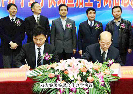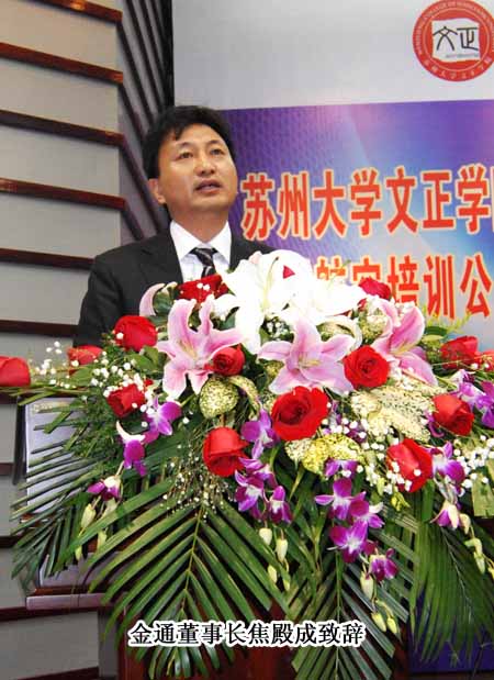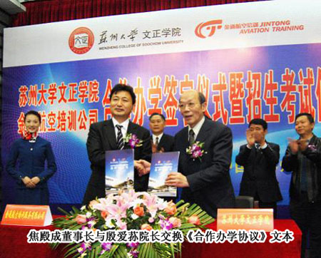 蘇州大學(xué)文正學(xué)院與金通航空培訓(xùn)簽署合作辦學(xué)協(xié)議 本網(wǎng)訊 隨著金通航空培訓(xùn)公司“校企合作”取得了可喜的成績,辦學(xué)規(guī)模日益擴大,在業(yè)內(nèi)影響力逐年提升。今年,金通航空培訓(xùn)再添佳績,與享譽美名、學(xué)風(fēng)扎實的蘇州大學(xué)文正學(xué)院達成合作。 12月8日下午,金通航空培訓(xùn)公司與蘇州大學(xué)文正學(xué)院合作辦學(xué)簽約儀式暨招生考試信息發(fā)布會隆重舉行。眾多媒體對此給予了充分關(guān)注并進行了深入報道。 蘇州大學(xué)黨委副書記、副校長江涌主持了此次會議,出席會議的嘉賓有金通航空培訓(xùn)公司董事長兼總經(jīng)理焦殿成、蘇州大學(xué)黨委書記王卓君、蘇州大學(xué)校長朱秀林、蘇州市教育局局長鮑寅初、文正學(xué)院副院長蔣峰等。 蘇州大學(xué)校長朱秀林在致辭中指出,簽署合作辦學(xué)協(xié)議,開啟了蘇州大學(xué)與金通航空培訓(xùn)服務(wù)有限公司的全面合作,預(yù)示了雙方“強強聯(lián)合、互惠雙贏”的全面開始。希望大家以聯(lián)合辦學(xué)為契機,進一步拓展合作空間,豐富合作內(nèi)容,為探索我國航空人才的教育與培養(yǎng)而努力奮斗! 金通董事長焦殿成在致辭中表示:隨著祖國民航業(yè)的快速發(fā)展,民航空乘人才作為民航系統(tǒng)的重要生產(chǎn)力,其選拔培養(yǎng)受到社會的廣泛關(guān)注。成為一名空中乘務(wù)員,是高校畢業(yè)生和家長展翅藍天的夢想。面對國家教育體制改革的良好趨勢,適逢我國民航業(yè)快速發(fā)展的有利契機,校企之間真誠合作,攜手培養(yǎng)社會需要的高端人才,將是高等院校和企業(yè)科學(xué)發(fā)展的的必由之路、創(chuàng)新之路和希望之路。金通與蘇州大學(xué)文正學(xué)院采用校企合作辦學(xué)模式,共同開辦本科層次的藝術(shù)設(shè)計專業(yè)(空乘方向),是合作雙方認(rèn)真考察、縝密調(diào)研、履行正規(guī)批報程序所做出的科學(xué)決策。 隨后,殷愛蓀與焦殿成簽署合作協(xié)議,并互贈禮物。 文正學(xué)院是中國高等教育多元化探索的產(chǎn)物,是最早創(chuàng)辦的公有民辦二級學(xué)院之一,后改辦為獨立學(xué)院。自1998年開辦以來,文正學(xué)院依托“母體”學(xué)校的雄厚師資而存在,與蘇州大學(xué)研究型大學(xué)定位不同的是,文正學(xué)院結(jié)合區(qū)域經(jīng)濟發(fā)展的現(xiàn)實需要,培養(yǎng)應(yīng)用型本科人才。從為適應(yīng)城市交通發(fā)展開設(shè)城市軌道交通相關(guān)專業(yè),到為適應(yīng)民航業(yè)發(fā)展開設(shè)空乘專業(yè),都顯示了文正學(xué)院緊貼社會需求進行人才培養(yǎng)的辦學(xué)思路和辦學(xué)實踐。 據(jù)悉,此次文正學(xué)院所開設(shè)的空乘專業(yè)為全日制藝術(shù)類本科,學(xué)制四年,計劃首屆在藝術(shù)類中招收200名空乘專業(yè)學(xué)生,將開設(shè)包括有民航發(fā)展史、客艙服務(wù)與管理、客艙設(shè)備使用與管理、民航乘務(wù)英語、民航空乘禮儀、客艙服務(wù)程序及標(biāo)準(zhǔn)動作實操等多門專業(yè)課程。同時,除常規(guī)教學(xué)外,文正學(xué)院還將為學(xué)生配置民航客機模擬訓(xùn)練艙、民航乘務(wù)員CBT教學(xué)軟件、含有世界所有民航客機模型182架等教學(xué)實訓(xùn)設(shè)備;為抓好學(xué)生教育管理工作,學(xué)院將設(shè)立空乘專業(yè)管理委員會,對學(xué)生實行半軍事化管理。學(xué)生通過文化與專業(yè)知識的學(xué)習(xí),接受空乘服務(wù)、英語、計算機等方面的技能訓(xùn)練,能夠熟練地運用專業(yè)技能為顧客提供優(yōu)質(zhì)服務(wù),同時通過專業(yè)實習(xí)環(huán)節(jié)提升綜合素質(zhì),成為文化素養(yǎng)高、專業(yè)技能強的高級空乘、地勤人員。 此次新聞發(fā)布會的召開標(biāo)志著金通與文正學(xué)院的合作正式啟動,為文正學(xué)院藝術(shù)設(shè)計專業(yè)(空乘方向)的美好將來打下堅實基礎(chǔ)。相信若干年后,雙方所共同培養(yǎng)出的空乘學(xué)子們,一定會不負(fù)眾望,成為我國民航界的中堅力量!