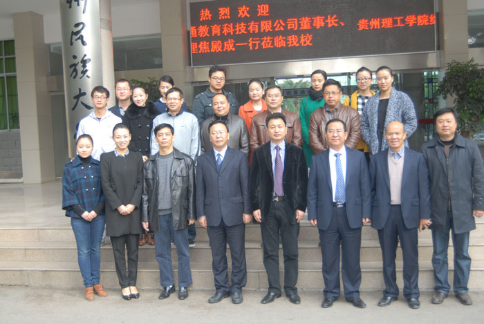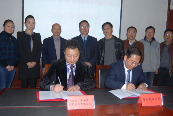 2013年11月15日,貴州民族大學(xué)與北京廣慧金通教育科技有限公司校企合作協(xié)議續(xù)約簽字儀式在貴州民族大學(xué)第一會(huì)議室舉行。 貴州民族大學(xué)黨委書(shū)記王鳳友,校長(zhǎng)張學(xué)立,副校長(zhǎng)楊昌儒、范允龍,北京廣慧金通教育科技有限公司董事長(zhǎng)兼總經(jīng)理焦殿成等出席了此次簽約儀式。簽約儀式由楊昌儒副校長(zhǎng)主持。