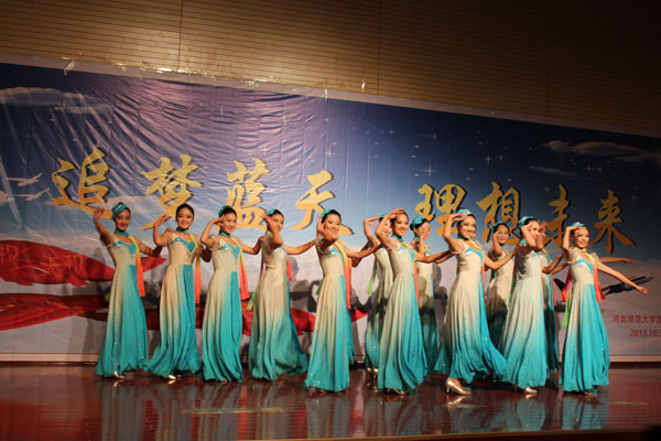 30日晚8點(diǎn),表演專業(yè)學(xué)生在美術(shù)樓報(bào)告廳舉行匯報(bào)演出,2013級(jí)表演專業(yè)的同學(xué)們表演了空乘服裝與禮儀展示、手語(yǔ)操等節(jié)目,展示了同學(xué)們?cè)谄鳂?lè)、舞蹈等方面的才藝。
