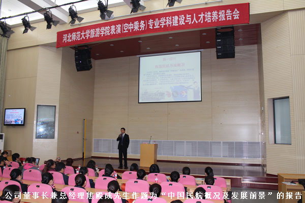 10月30日下午,為慶祝表演(空中乘務(wù))專業(yè)實(shí)訓(xùn)室圓滿落成,河北師范大學(xué)旅游學(xué)院召開(kāi)了表演(空中乘務(wù))專業(yè)學(xué)科建設(shè)與人才培養(yǎng)報(bào)告會(huì)。校企合作單位——北京廣慧金通教育科技有限公司董事長(zhǎng)兼總經(jīng)理焦殿成先生作題為“中國(guó)民航概況及發(fā)展前景”的報(bào)告。河北師范大學(xué)旅游學(xué)院全體教職工及2013級(jí)表演專業(yè)學(xué)生聽(tīng)取了報(bào)告會(huì)。