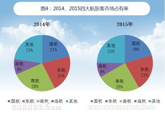 從各家航空公司比較重視的旅客市場(chǎng)占有率情況來(lái)看,2014年四大航(此處僅統(tǒng)計(jì)了上市公司數(shù)據(jù))以外的公司占23%,2015則提升至25%,四大航的市場(chǎng)份額旅游下降,增長(zhǎng)較快的東航、海航份額保持不變,而國(guó)航、南航則分別下降一個(gè)百分點(diǎn)。