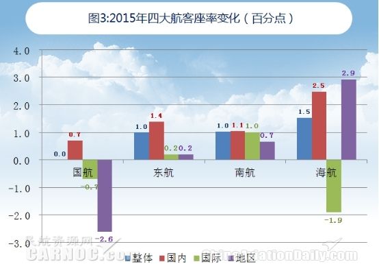 在2015年,四大航整體表現(xiàn)較好,尤其在客座率方面,都呈現(xiàn)不同程度的提升,除國(guó)航略微提升外,東航、南航、海航客座率提升幅度都在1個(gè)百分點(diǎn)以上,其客座率也均超過(guò)了80%,其中海航的客座率達(dá)到了驚人的88.2%,其中國(guó)內(nèi)航線(xiàn)客座率為89.7%,這基本上達(dá)到了低成本航空公司的水平。東航、南航在國(guó)內(nèi)、國(guó)際、地區(qū)航線(xiàn)上客座率全面得到提升。