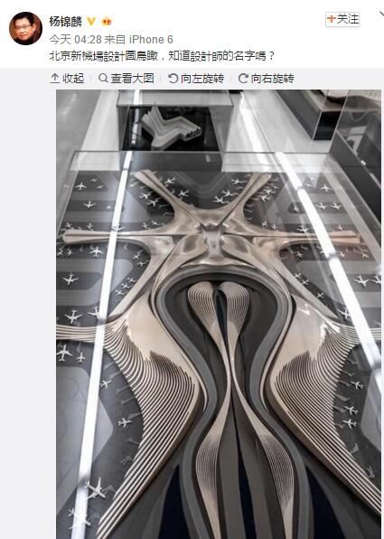 4月11日,微博大V楊錦麟發(fā)了一條北京新機(jī)場(chǎng)設(shè)計(jì)鳥(niǎo)瞰圖的微博。并問(wèn)“知道設(shè)計(jì)師的名字嗎?” 這張圖片立刻引發(fā)了許多網(wǎng)友的評(píng)論和戲謔。