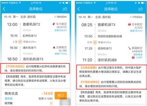 圖:攜程APP航班詳情頁面有關(guān)不同機場轉(zhuǎn)機和過境簽的提醒