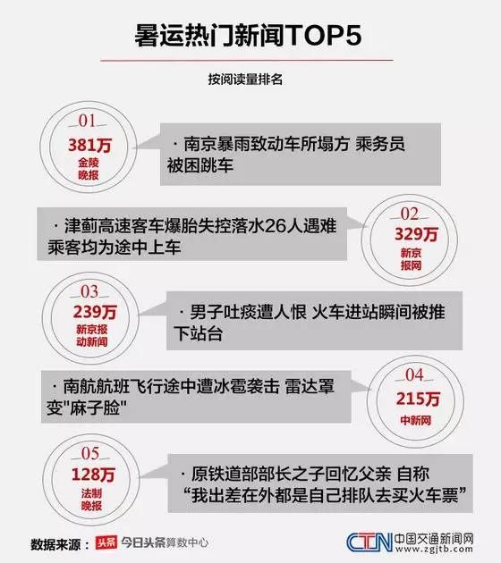 在最受讀者關(guān)注和閱讀數(shù)量最高的新聞中,涉及鐵路客運(yùn)的新聞報(bào)道占據(jù)半壁江山,其中《南京暴雨致動(dòng)車所塌方乘務(wù)員被困跳車》成為暑運(yùn)期間熱度最高的交通運(yùn)輸領(lǐng)域新聞。