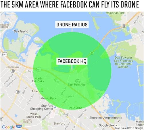 圖:Facebook無人機可飛行的五公里區(qū)域。