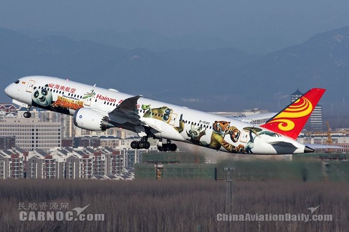 海航計(jì)劃推出6架《功夫熊貓》主題彩繪涂裝波音787-9飛機(jī),于2016-2017年陸續(xù)完成并投入使用,未來計(jì)劃執(zhí)飛海航中國至北美航線。