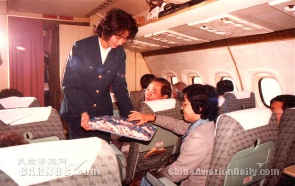 圖:1980年乘務(wù)員在機(jī)上提供餅干