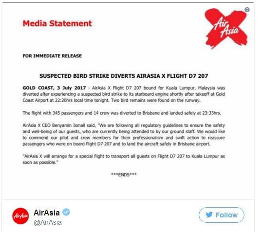 亞航X在事后發(fā)表聲明稱:“亞航X飛馬來西亞吉隆坡的D7207次航班在其右側(cè)發(fā)動機疑似遭受鳥擊之后進行了備降。在跑道上發(fā)現(xiàn)了兩只鳥的尸體。”