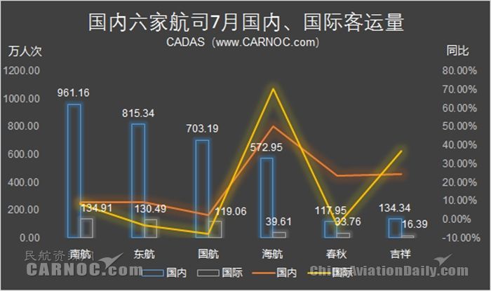 圖:7月份各航司國(guó)內(nèi)、國(guó)際航線旅客運(yùn)輸量