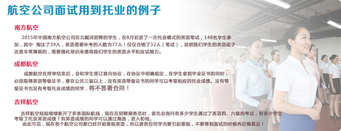由于乘務(wù)員職業(yè)需要無國(guó)界的與人交流,也隨著我國(guó)民航事業(yè)的發(fā)展壯大,對(duì)民航乘務(wù)員英語水平要求的不斷提高,近年國(guó)航、南航、海航等國(guó)內(nèi)航空公司都早已開始采用國(guó)際標(biāo)準(zhǔn)來選拔乘務(wù)員,這也就是我們?yōu)槭裁匆恢痹诔珜?dǎo)托業(yè)英語培訓(xùn)與考試。